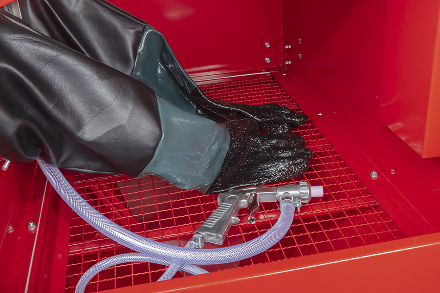 Пескоструйная камера подходит для обработки различных деталей и предназначена для снятия грунта, краски, ржавчины. Позволяет производить обработку изделий и инструментов без создания специального пространства и дополнительной защиты оператора. В верхней части располагается прозрачное стекло для обзора детали. Для работы необходимо подключитель изделие к системе подачи сжатого воздуха.