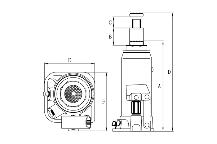 Min высота подхвата, мм (А) Ход штока, мм (B)  Длина регулирововчного винта, мм(С) Max высота подхвата, мм(D)   Ширина основания, мм (E) Длина основания, мм(F)