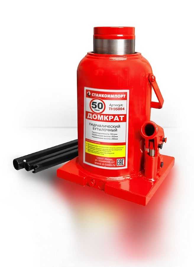 Домкрат бутылочный грузоподъемностью до 50 тонн используется при ремонте и техническом обслуживании транспортных средств, для поднятия тяжестей при строительстве или ремонтных работах.