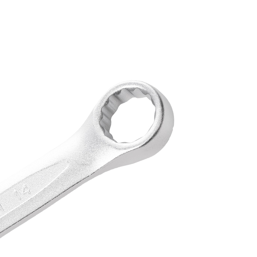 Финишная обработка Soft matt и хром никелевое покрытие комбинированного ключа обеспечивает надежную защиту от коррозии, а также надежный хват и препятствует выскальзыванию инструмента из рук. 12-гранный профиль накидной части подходит к головкам болтов и гайкам как 6-, так и 12-гранного профиля, и обеспечивает 5 градусный шаг перехвата. Специальный отгиб, в 15 градусов накидной части ключа позволит работать в местах с ограниченным доступом к крепежу и поможет подобраться к крепежу как с торца, так и с боку, в зависимости от места выполняемых работ.