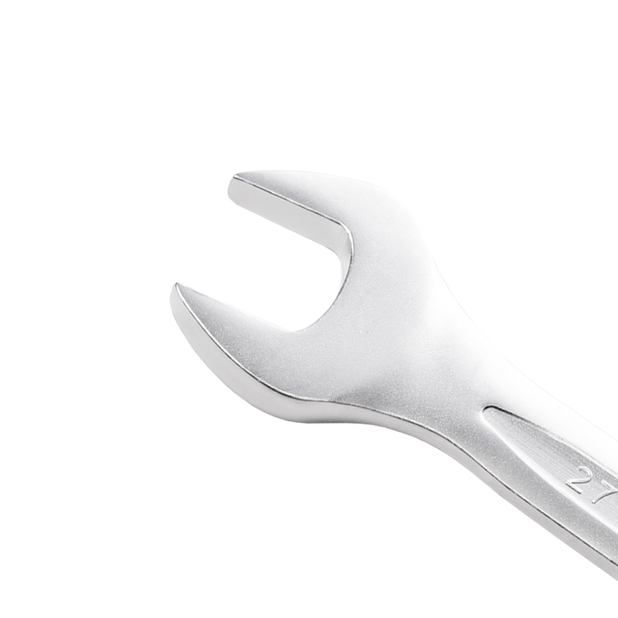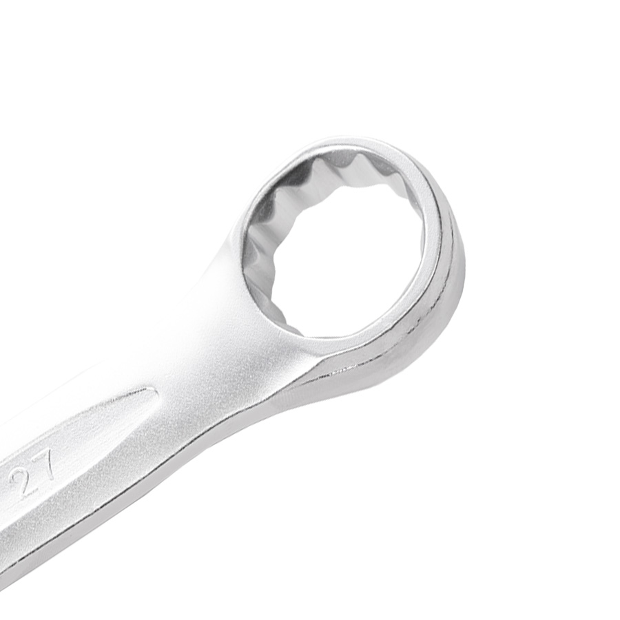 Финишная обработка Soft matt и хром никелевое покрытие комбинированного ключа обеспечивает надежную защиту от коррозии, а также надежный хват и препятствует выскальзыванию инструмента из рук. 12-гранный профиль накидной части подходит к головкам болтов и гайкам как 6-, так и 12-гранного профиля, и обеспечивает 5 градусный шаг перехвата. Специальный отгиб, в 15 градусов накидной части ключа позволит работать в местах с ограниченным доступом к крепежу и поможет подобраться к крепежу как с торца, так и с боку, в зависимости от места выполняемых работ.