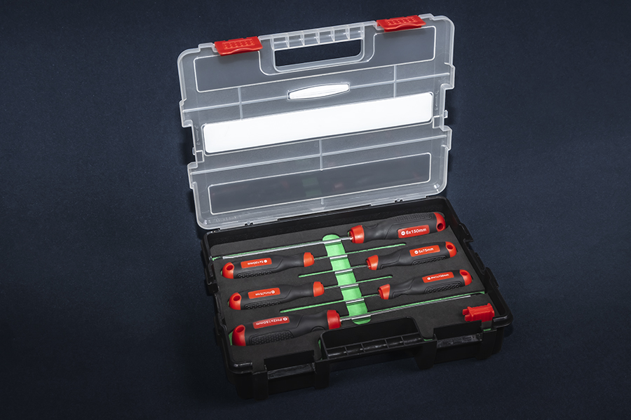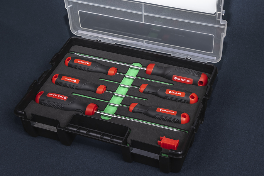 Набор отверток 6 предметов изготовлен из высококачественной легированной хром-ванадиевой инструментальной стали, с последующей закалкой до твердости в пределах 46-48HRC, что соответствует всем требования нормативной документации. Наконечник проходят дополнительную термическую обработку с целью получения оптимального сочетания твердости и пластичности. Стержень имеет глубокую посадку с крепление в двух точках, что исключает проворачивание стержня в рукояти. Отвертка снабжена двухкомпонентной эргономичной рукоятью. Рукоять имеет специальное отверстие, поэтому отвертку можно с легкостью разместить на вертикальной поверхности или установить темляк. Благодаря высококачественным компонентам рукоять имеют высокую стойкость к агрессивным средам.