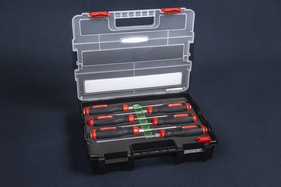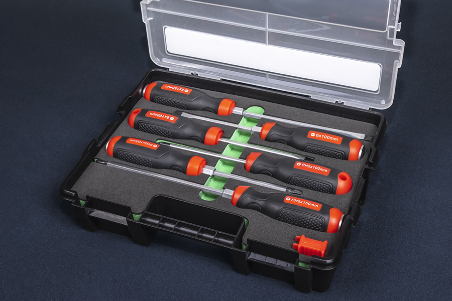 Набор отверток 6 предметов изготовлен из высококачественной легированной хром-ванадиевой инструментальной стали, с последующей закалкой до твердости в пределах 46-48HRC, что соответствует всем требования нормативной документации. Наконечник проходят дополнительную термическую обработку с целью получения оптимального сочетания твердости и пластичности. Стержень имеет глубокую посадку с крепление в двух точках, что исключает проворачивание стержня в рукояти. Отвертка снабжена двухкомпонентной эргономичной рукоятью. Благодаря высококачественным компонентам рукоять имеют высокую стойкость к агрессивным средам.