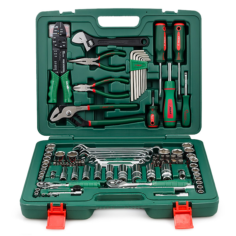 В набор инструментов TK-148 входят 148 предметов с посадочными квадратами ¼" и 3/8". Для их изготовления используется первоклассная хромванадиевая сталь — прочный и долговечный материал.