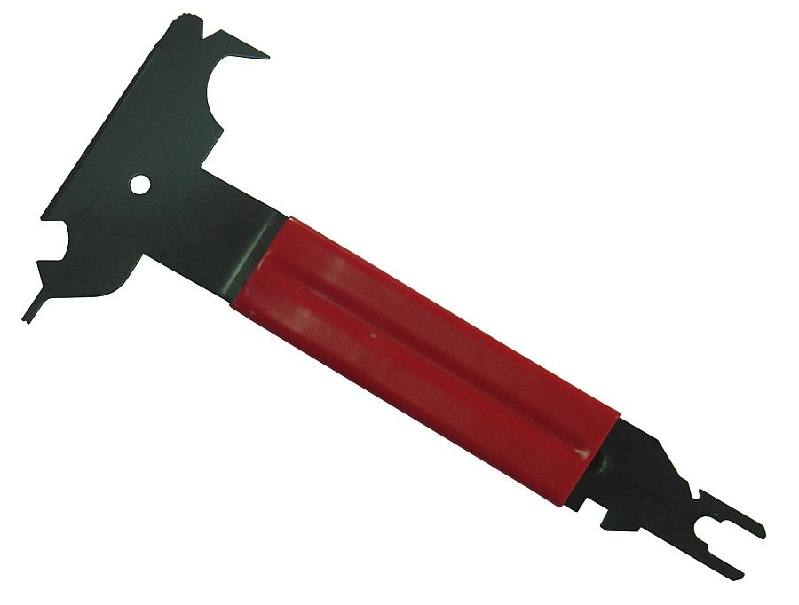 Инструмент из закаленной пружинной стали, красная пластиковая ручка.