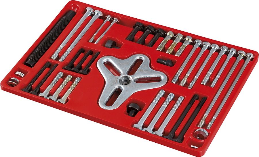 Набор удобен в работе и, благодаря различным фиксирующим болтам и центрующим насадкам, является универсальным. Подходит для большинства марок и моделей легковых автомобилей.