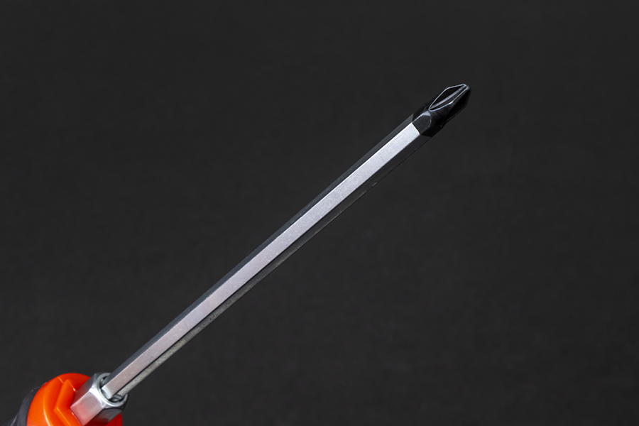Отвертка изготовлена из высококачественной легированной хром-ванадиевой инструментальной стали, с последующей закалкой до твердости в пределах 46-48HRC, что соответствует всем требования нормативной документации. Наконечник проходит дополнительную термическую обработку с целью получения оптимального сочетания твердости и пластичности. Сквозная посадка стержня и металлический затыльник позволяют применять ударное воздействие. Шестигранный профиль у основания рукояти позволяет посредством ключа существенно увеличить усилие, передаваемое крепежу. Отвертка снабжена двухкомпонентной эргономичной рукоятью. Благодаря высококачественным компонентам рукоять имеют высокую стойкость к агрессивным средам.