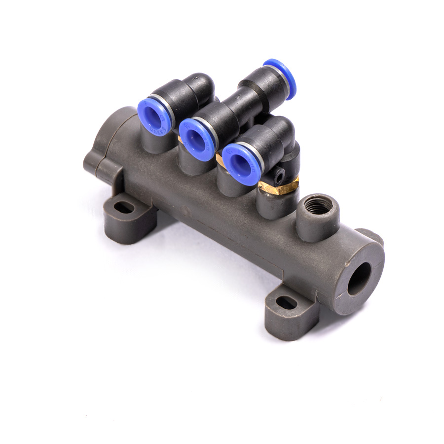 Пяти-ходовой клапан в сборе. Распределяет потоки сжатого воздуха от источника к исполнительным узлам. Механическое управление осуществляется педальным узлом станка.