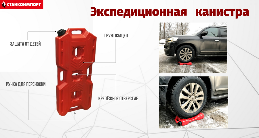 -  увеличенная толщина стенки и наличие в корпусе канистры специальных грунтозацепов, которые позволяют использовать данную канистру в качестве санд-трака.